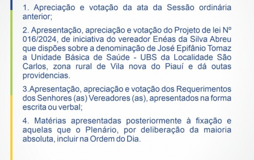 Outro ponto importante será a discussão e votação do Projeto de Lei Nº 016/2024, de autoria do vereador Enéas da Silva Abreu, que propõe a denominação de “José Epifânio Tomaz” à Unidade Básica de Saúde (UBS) da localidade São Carlos, situada na zona rural do município.