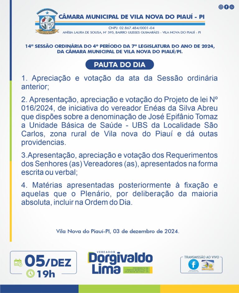 A Câmara Municipal de Vila Nova do Piauí realizará, na próxima quinta-feira (5), a 14ª Sessão Ordinária do 4º Período da 7ª Legislatura de 2024. O encontro está marcado para às 19h, na sede oficial da Casa Legislativa.